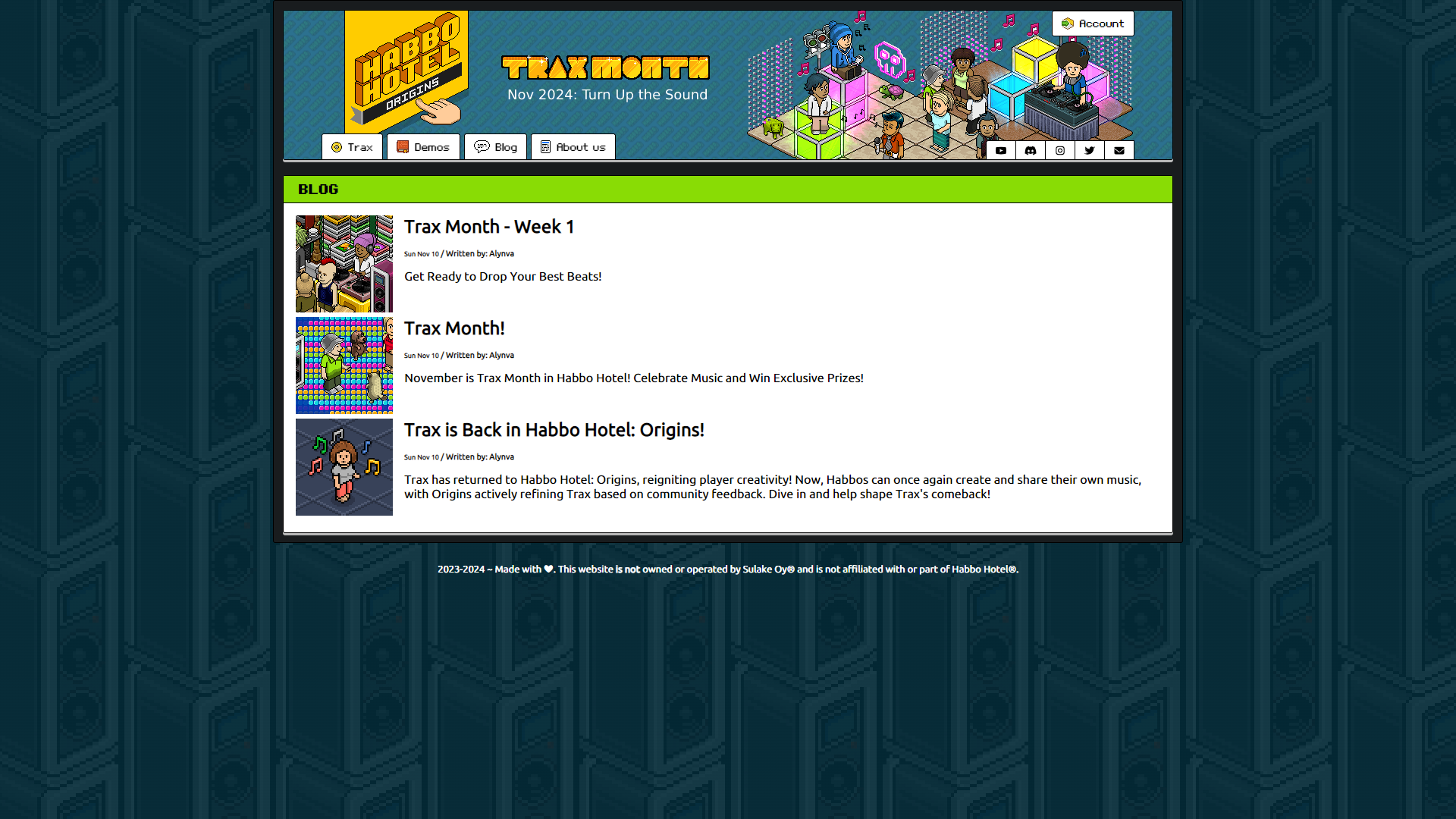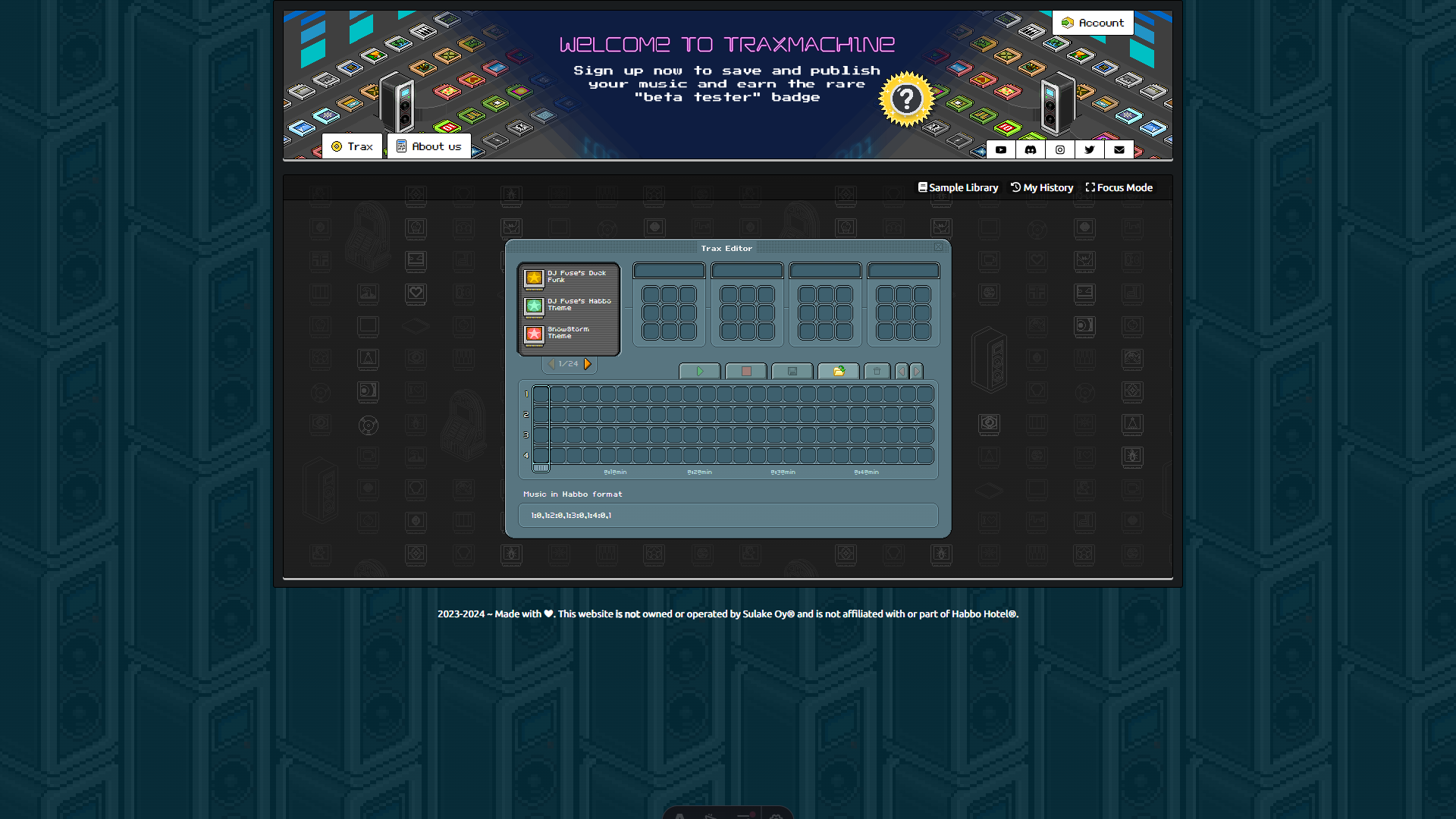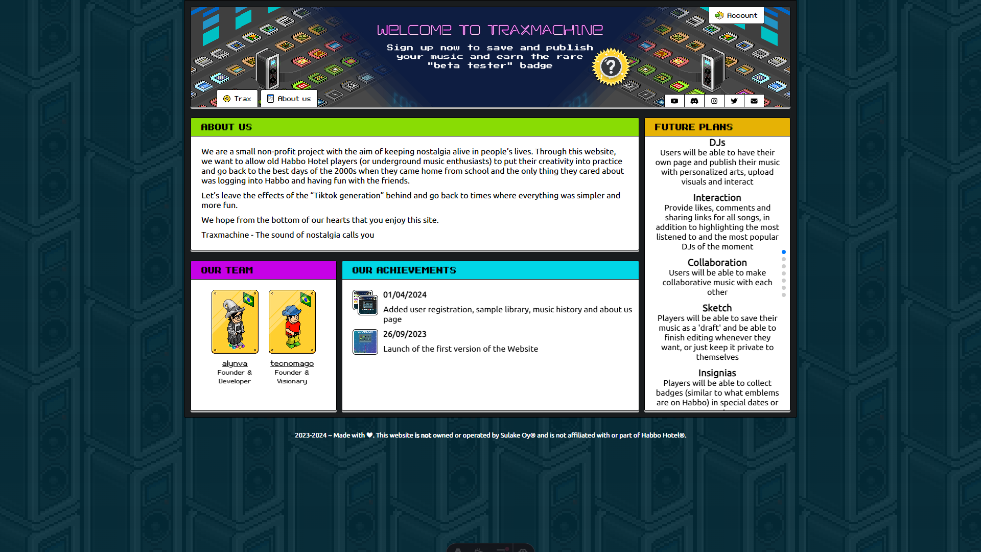 We are a small non-profit project with the aim of keeping nostalgia alive in people’s lives. Through this website, we want to allow old Habbo Hotel players (or underground music enthusiasts) to put their creativity into practice and go back to the best days of the 2000s when they came home from school and the only thing they cared about was logging into Habbo and having fun with the friends.