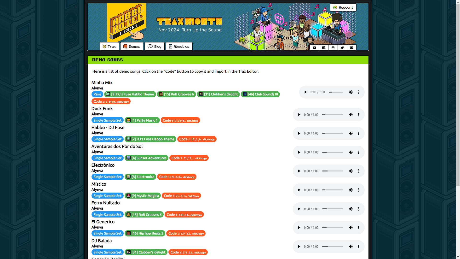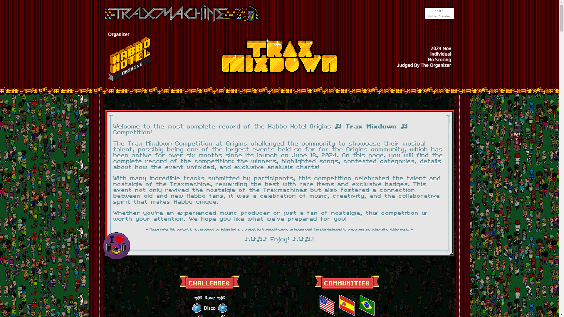 We are a small non-profit project with the aim of keeping nostalgia alive in people’s lives. Through this website, we want to allow old Habbo Hotel players (or underground music enthusiasts) to put their creativity into practice and go back to the best days of the 2000s when they came home from school and the only thing they cared about was logging into Habbo and having fun with the friends.